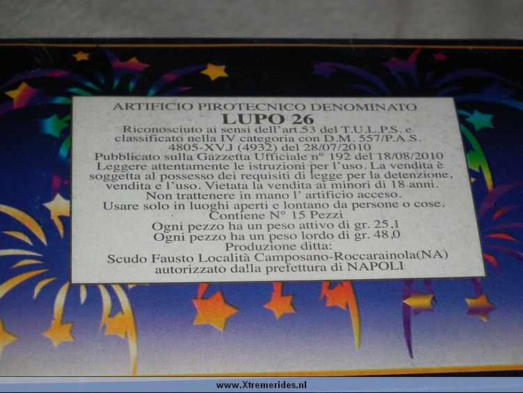 Dit vuurwerk komt uit Italie en wordt daar vrij verkocht. Het valt nog niet onder consumentenvuurwerk maar wel ongeveer het meest zware wat je in Italie kunt kopen.